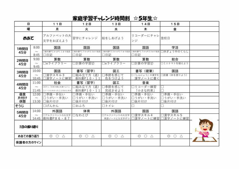 5年生 チャレンジ時間割です。時間割を見てしっかり勉強しましょうね。