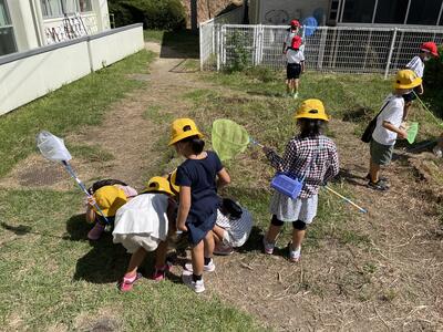 気持ちのよい秋晴れのもと、低学年の子どもたちが校庭で「生き物探し」をしていました。