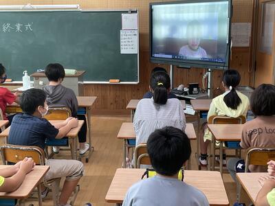 約半数の子どもたちが登校し、残りの子どもたちはそれぞれの家庭でオンラインで教室とつながって授業を進めます。はじめての取組で、通信トラブルやハプニングもありましたが、子どもたちはオンラインでの友だちとの交流を楽しんでいたようです。