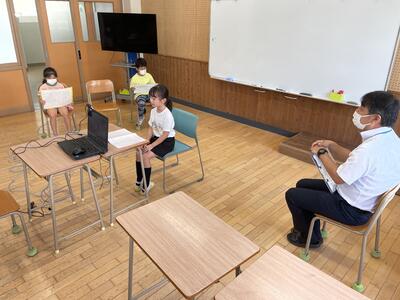 英語では、英語専科の先生がオンライン参加の子どもたちの反応を見ながら授業を進め、教室では担任が子どもたちの学習の様子を確認するようにしています。