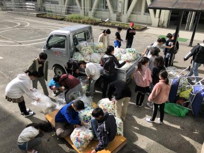 ボランティア委員会では、毎年ペットボトルのキャップを回収しています。今年度も毎週金曜日に回収していました。この集められたキャップは、世界で苦しむ子どもたちのワクチンに変わります。
