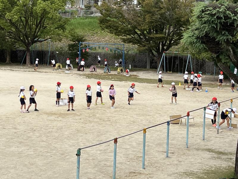 ボール投げ遊びを楽しそうにする2年生の様子です。