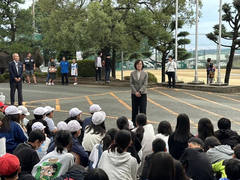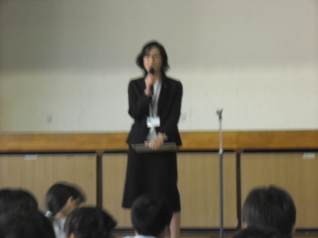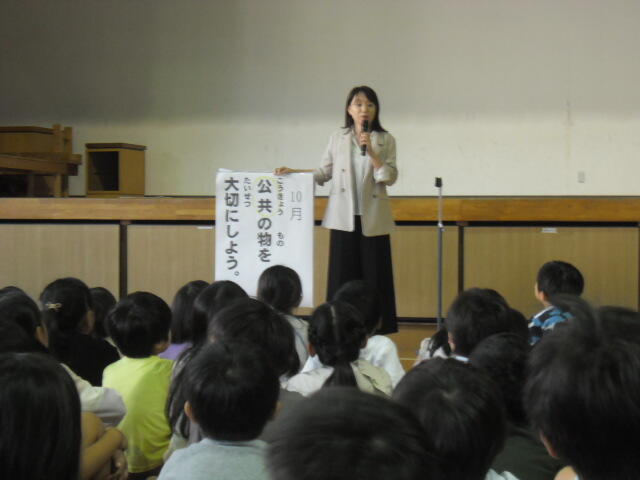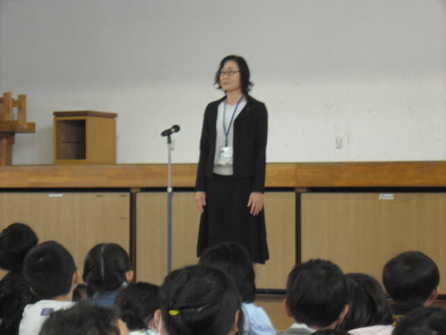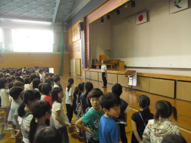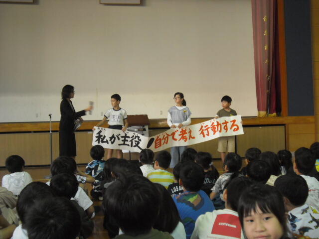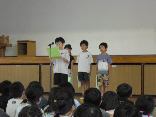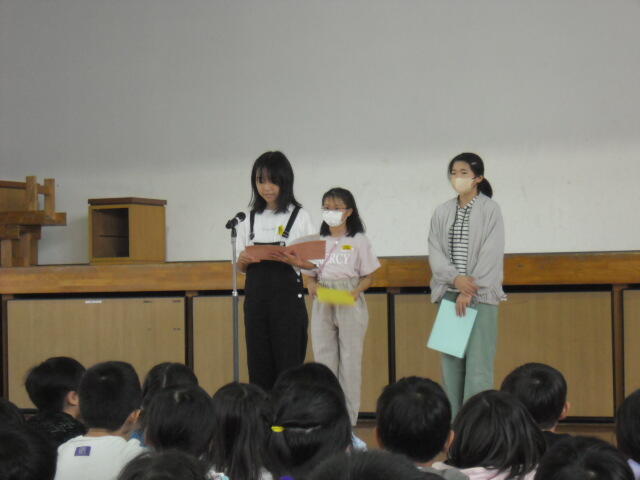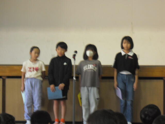 2年生、4年生の代表発表、校長の話、生徒指導主任の話、校歌斉唱を行いました。