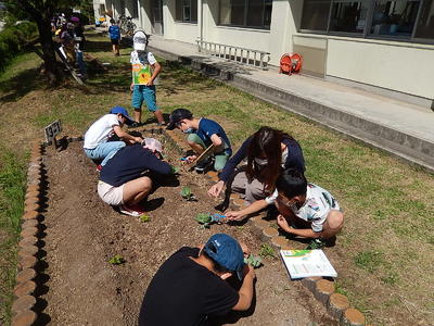 3年生は校舎の外にある学級園に行き、キャベツの苗に付いている「モンシロチョウのタマゴ」の観察をしていました。