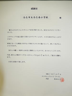 エコキャップ運動を行っているエコキャップメイト「アーチ」というところにキャップを持って行き、感謝状をいただきましたので、校内に掲示しておきます。