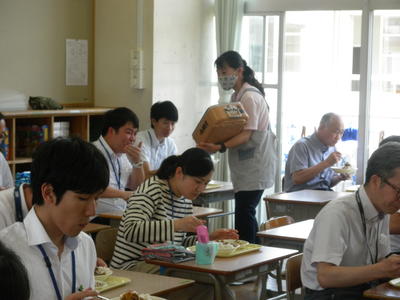 しかし、給食(配膳や飲食、片付け)にはリスクがありますので、実際に先生たちが子ども役になって給食当番をしたり、教室で給食を食べたりしてみました。