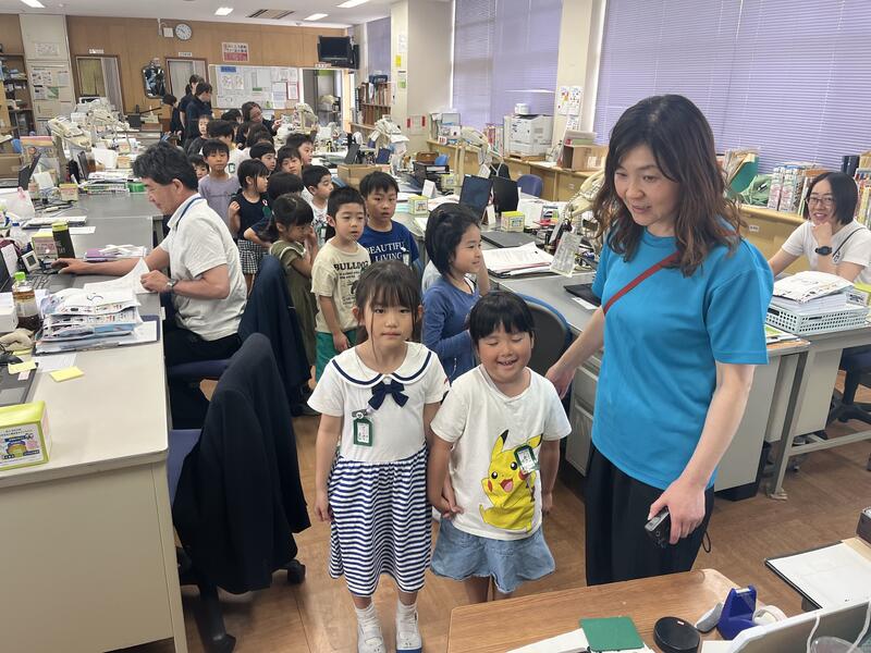 1年4組のみなさんが職員室に、学校探検に来ました。