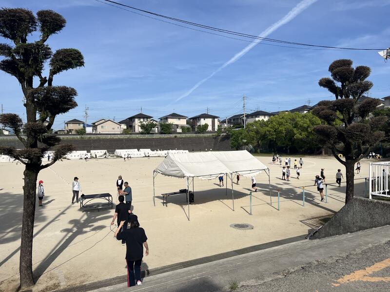 運動会係の保護者方にも手伝ってもらいテント立て、第一弾ができました