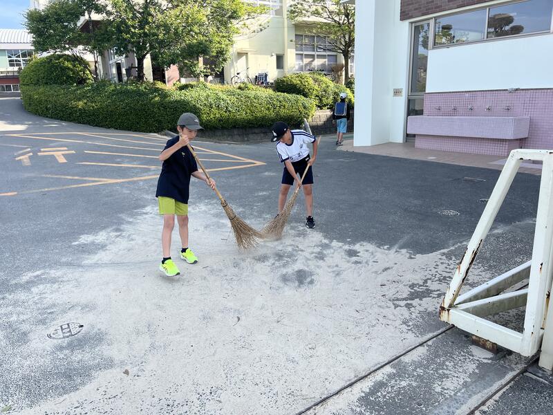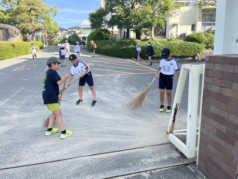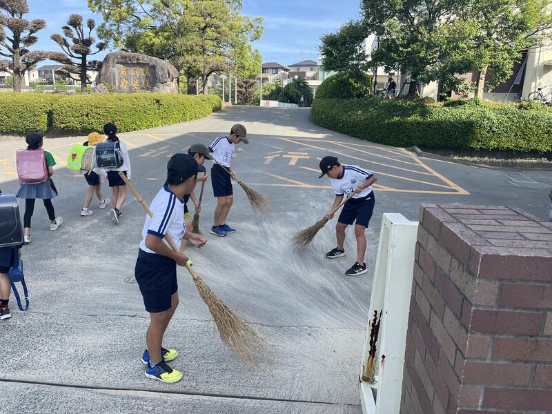 正門前の砂を掃除してくれた5年生 気づき、行動する力 素晴らしい