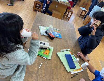 3年理科「音の性質」【2.9】 投稿日時 : 2022/02/09 学校サイト管理者 3年生の理科では「音や光の性質」を学習しています。 今回、実験で使ったのは「糸電話」です。子どもたちは、不思議そうに聞こえてくる音に耳を傾けていました。途中で、たこ糸が振動していることにも気づき、音の伝わり方を実感することができたようです!