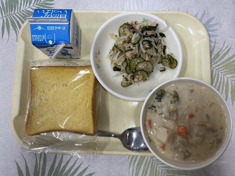 今日は野菜たっぷりの給食です。野菜のスープにはいっているほうれん草は、色の濃い緑黄色野菜でビタミンCやビタミンA、ほかにも鉄分やカリウムなどが豊富に含まれています。体の調子を整えてくれる大事な栄養素ですね。