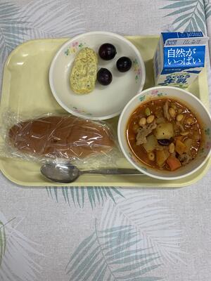 今日は、大豆がたっぷり入ったポークビーンズ。大豆にはタンパク質がたくさん入って、成長に欠かせない栄養とのこと。デザートのぶどうは、秋の味覚ですね。