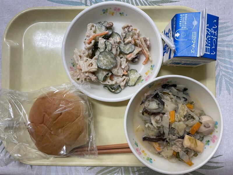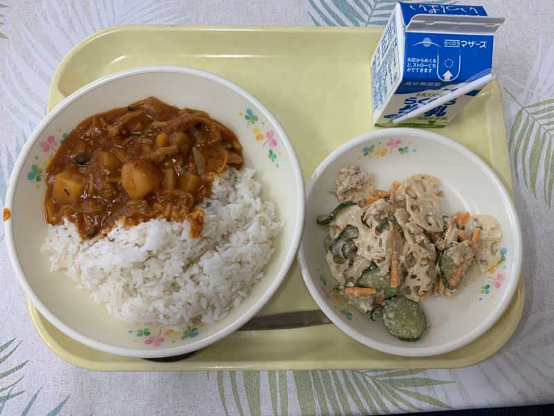 今日はみんなが大好きなハヤシライスとシャキシャキのレンコンサラダでした。切り方や料理の仕方で食感がかわるれんこん、きゅうりやツナの他の食材と合わさって、楽しい食感でした。