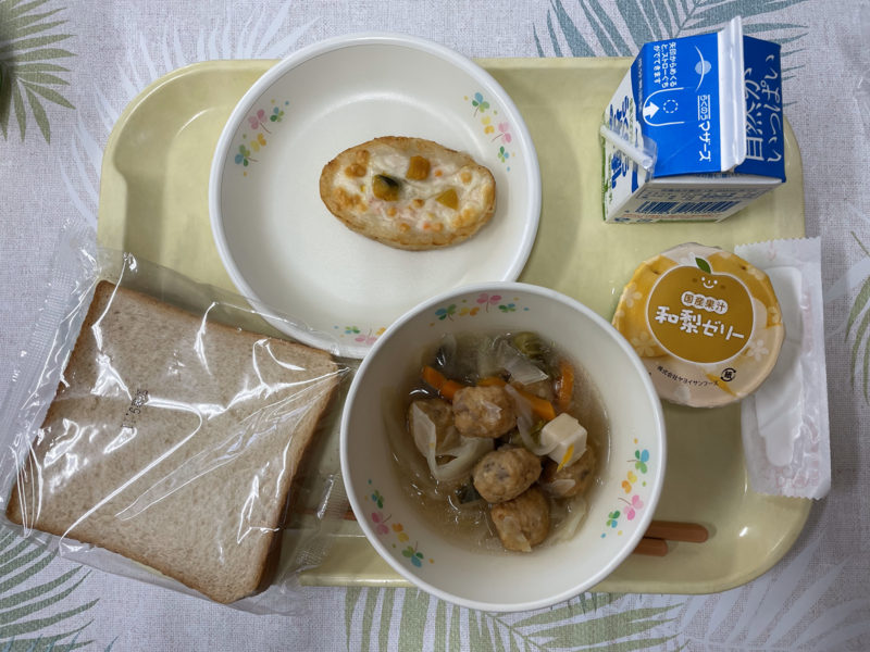 今日のポテトカップグラタンはなんと容器がじゃがいもで作ってあります!まるごと食べられる上に香ばしくてとてもおいしかったです。ごぼうの入った肉団子のスープでほっこりできました。