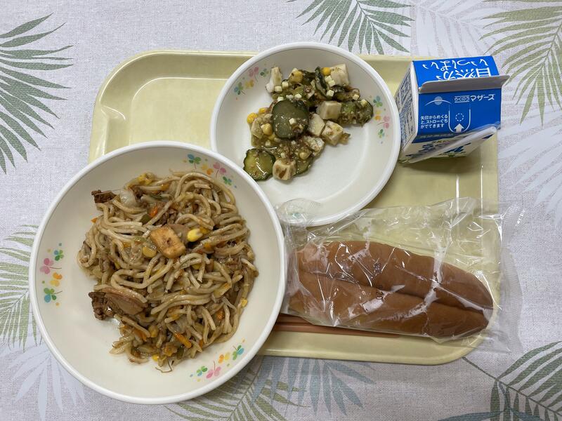 焼きそばが発明された野は戦後のことだそうです。小麦粉が手に入りやすかったことから生まれました。今日はコッペパンがカットしてあるので、焼きそばパンにもできました!アボカドと豆腐の珍しいサラダもおいしくいただきました。