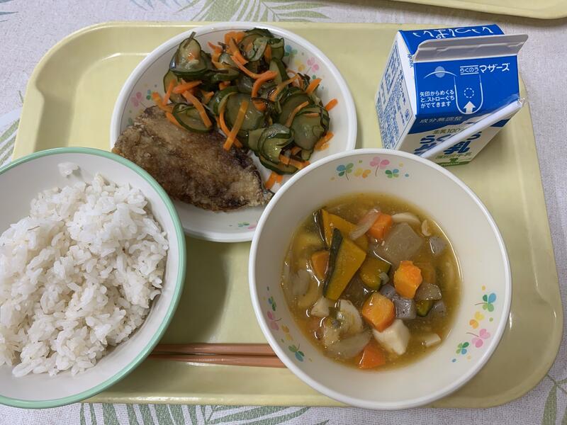 秋の気配が近づいてきて、さつまいものおいしいスープが嬉しい献立です。米粉を使ってとろみをつけているそうで、ほっこりやさしい味でした!