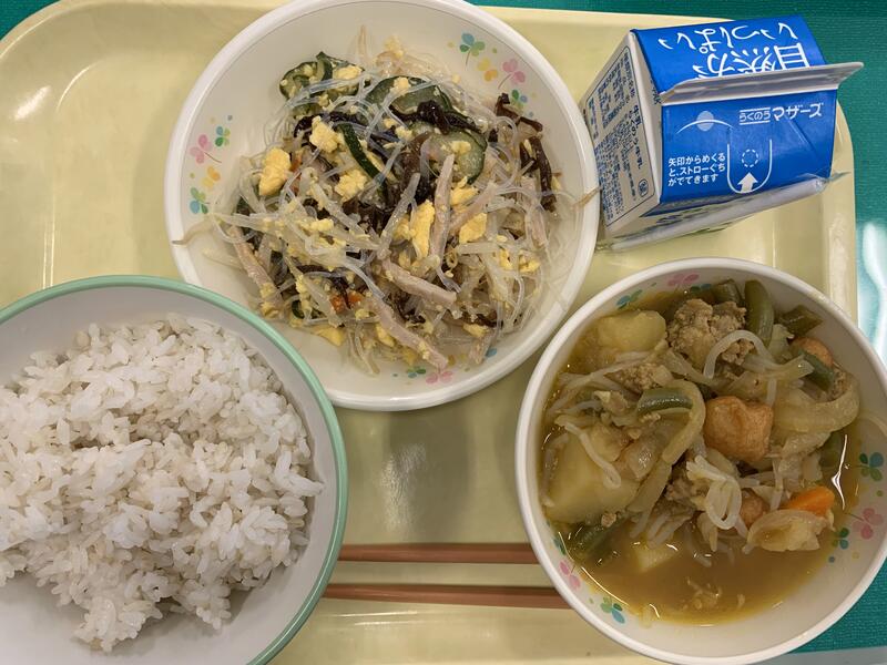 地元でとれたジャガイモをつかった肉じゃがです。カレー味のちょっと珍しい味付けはごはんがすすみます!じゃがいもにはビタミンCが多く含まれるそうですよ。