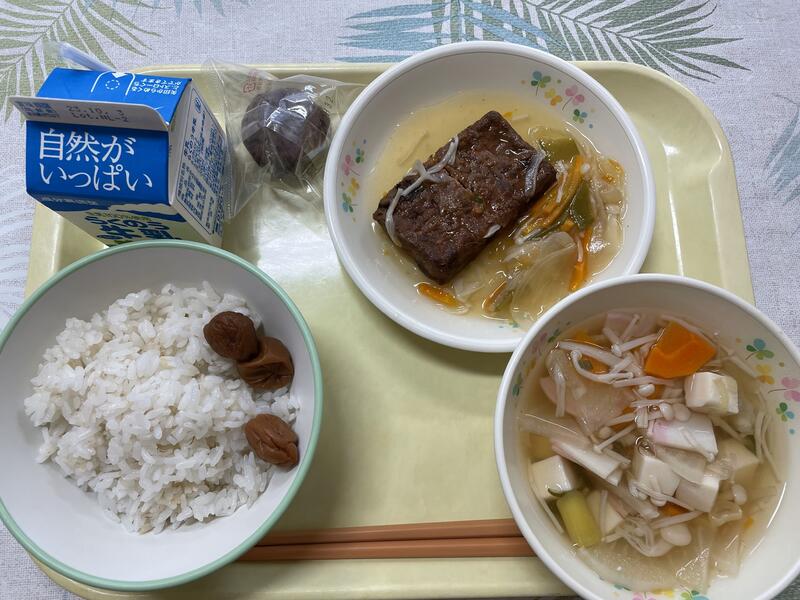 今日は、ふるさとくまさんデーのメニューです。ごはんに入っている栗は球磨地区の特産品、つぼん汁は人吉球磨地区の郷土料理です。つぼん汁の名前はお祝いのときに壺のような器にいれていたことからきているそうですよ。