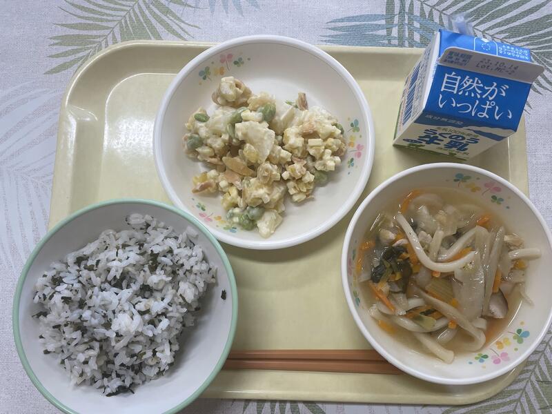 さつまいものおいしい季節がやってきました。さつまいものサラダにはチーズや枝豆、ナッツなど食材がたくさん使われていました。五目うどんもしっかり体を元気にしてくれそうです。