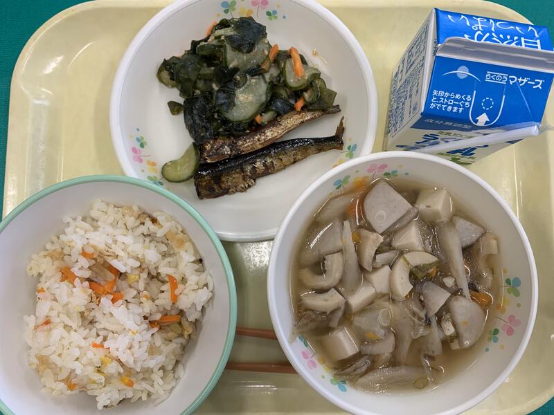 今日は、ふるさとくまさんデーのメニューです。ごはんに入っている栗は球磨地区の特産品、つぼん汁は人吉球磨地区の郷土料理です。つぼん汁の名前はお祝いのときに壺のような器にいれていたことからきているそうですよ。