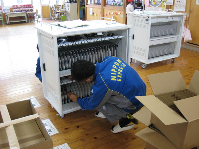 今日は午前中から業者の方々が来校され、一台一台動作確認を実施され、その後保管庫への設置が行われました。