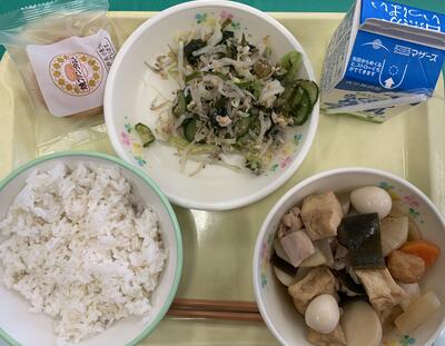 今日の合志市の朝は冷え込みました こんな日にぴったりの「おでん」が献立に登場! うれしい限りです。また、今日は減塩給食「やさ塩デー」の献立です。おでんは「かつお節と昆布のだし」で煮込んであり、だしがしみこんだ美味しいおでんでした。海藻サラダは、噛むと味が出る「ちりめん」や「ツナ」を利用して塩分量を減らす工夫がしてあるそうです。