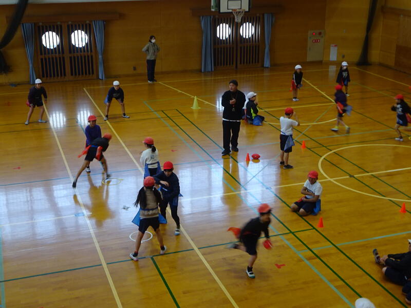 子どもたちは、腰にはめたタグをとられないような動きや、得点を得るための作戦など楽しく学んでいました。