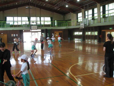 明け方に雨が降り、運動場が使えないということで、体育館での実施となりました。