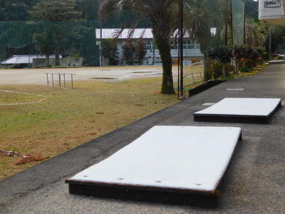 縄跳びのジャンプ台や体育館の屋根にまだ雪が残っています。