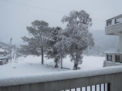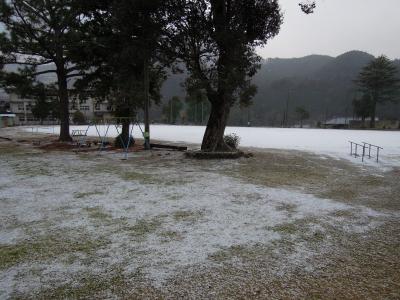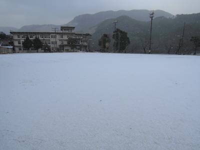 縄跳びのジャンプ台や体育館の屋根にまだ雪が残っています。