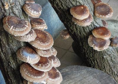 原木栽培の椎茸は「育つとこのようになりますよ」という見本として展示しています。