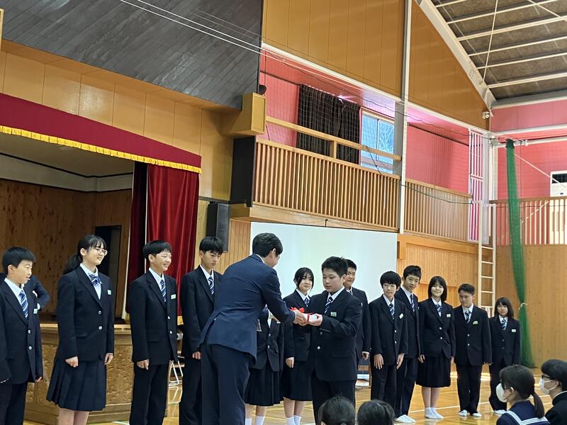 今年度より新設した「第7学年進級式」では、新しいブレザーに身を包んだ7年生の紹介や校長先生からの式辞、村教育委員会からの記念品贈呈、決意発表等がありました。