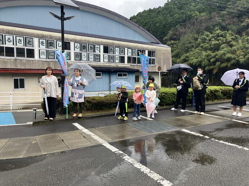本日は朝からあいにくの雨となりましたが、こがね保育園の園児と一緒に挨拶運動を行いました。