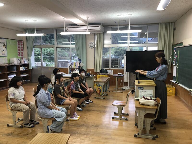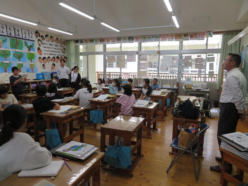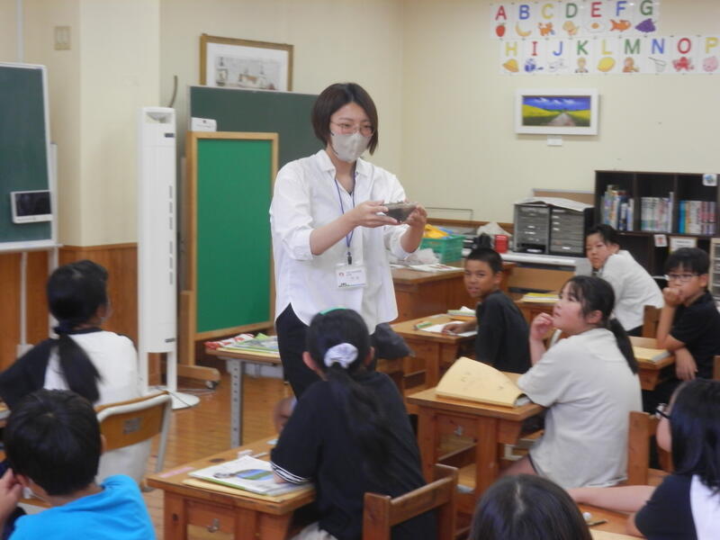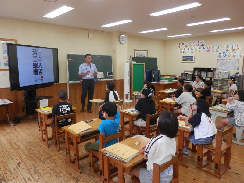 10月16日(木)に熊本県教育庁教育総務局文化課より3名の先生に来校いただき、令和2年7月豪雨に関することや球磨村の文化財について説明をしていただきました。4年生は、球磨村の球泉洞の資料、球磨川のメガロドンの化石や球磨村にある遺跡を教えてもらいながら、文化財を守り、伝えていくことの大切さについて学ぶことができました。