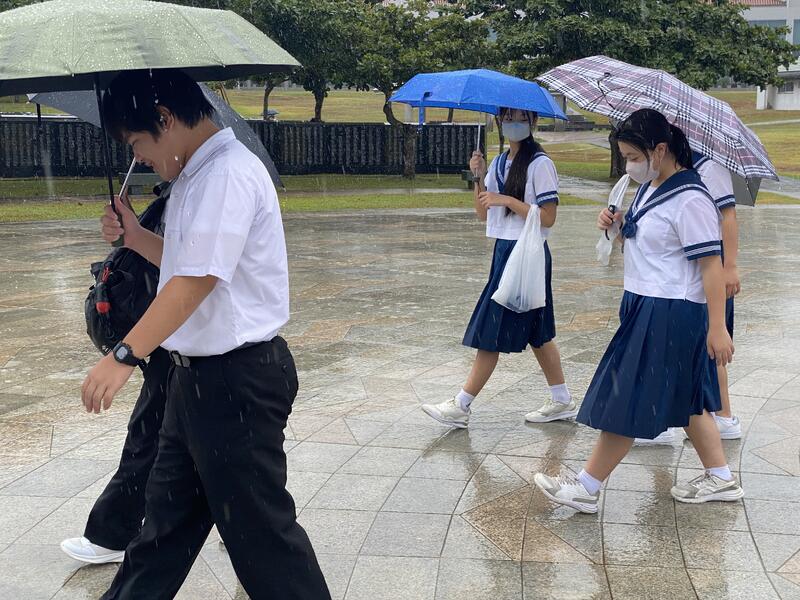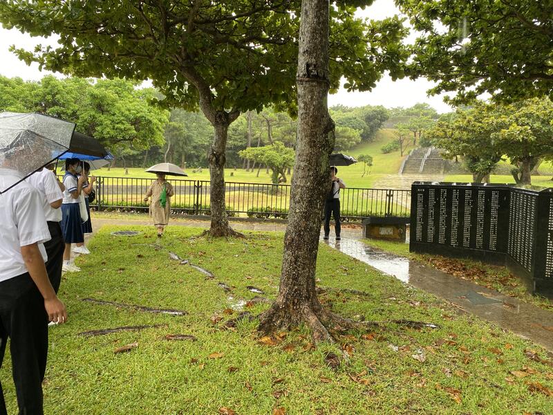 那覇到着時には土砂降りで、バスから降りるのも一苦労でしたが、平和祈念資料館見学の間に雨があがりました!