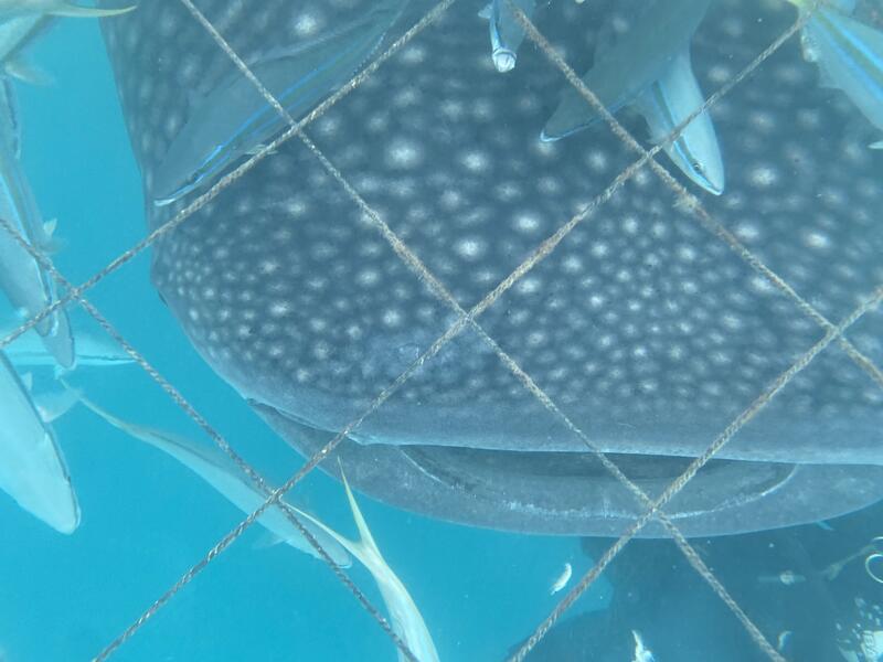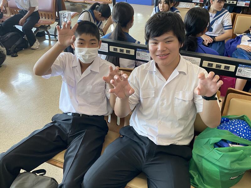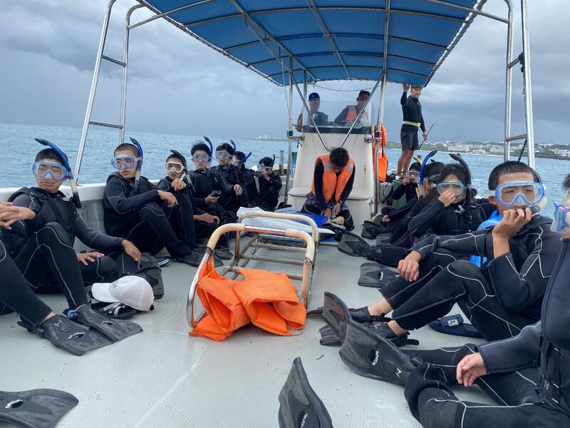 シュノーケリングは連日の雨で水が濁っており、急遽ジンベエザメが見れるプランに変更されました。ジンベエザメを目の前にすると大迫力で興奮していた生徒たちでしたが、いざ海に入ると波が高く、体験が終わる頃にはみんなぐったりしてしまいました…。