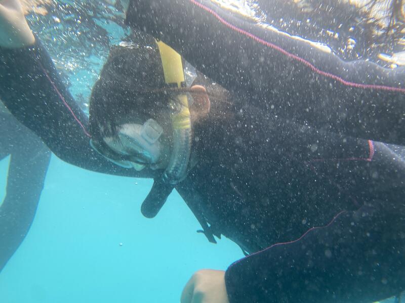 むら咲むらで11時に早めの昼食をとった後、シュノーケリング体験と絞り染め体験の2つに分かれて体験活動を行いました。