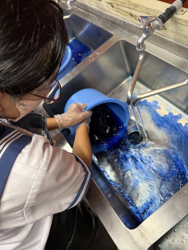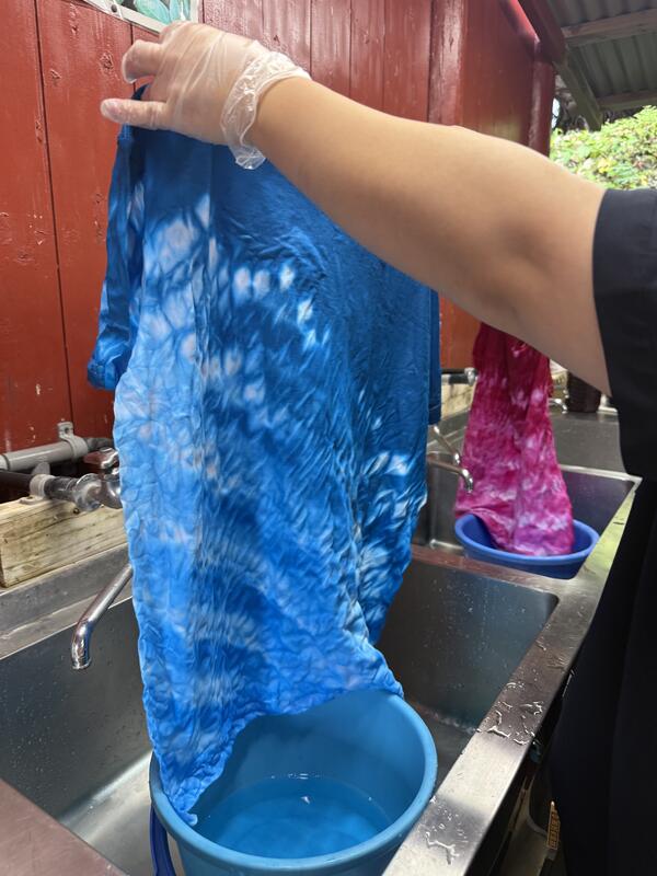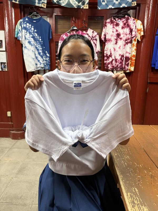 絞り染め体験は、リュウキュウアイという植物を原料にした染料を使い、真っ白なTシャツからピンクやブルー、藍色の可愛らしいTシャツが完成しました!