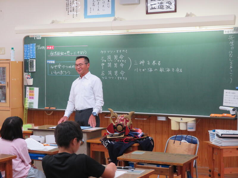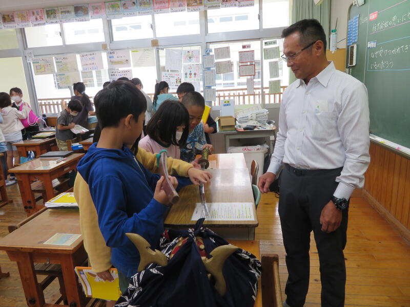 10月23日(木)に4年生は社会科で伝統芸能について学びました。今回は、球磨村の伝統芸能の1つである住吉谷奴保存会の松野さんに来校いただき、説明してもらいました。道具等もご持参いただき、子どもたちは手に取り、学びを深めることができました。ご協力ありがとうございました。