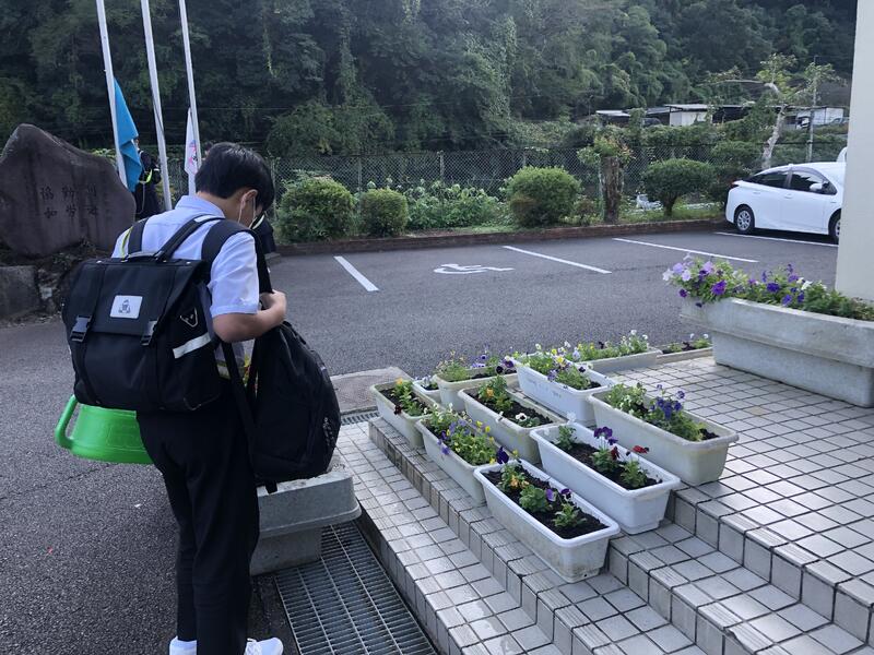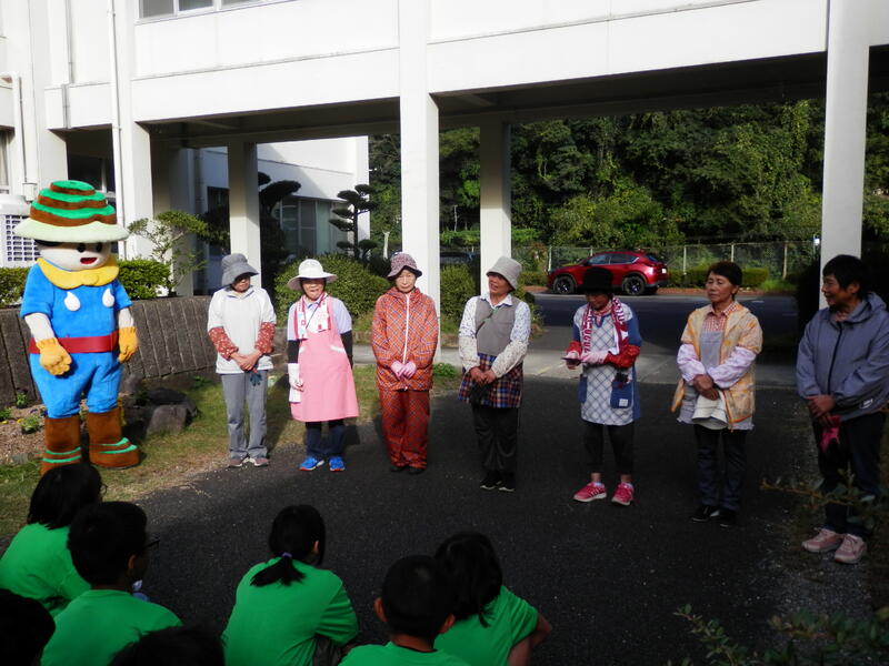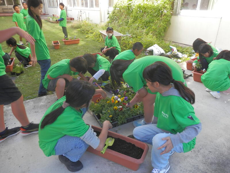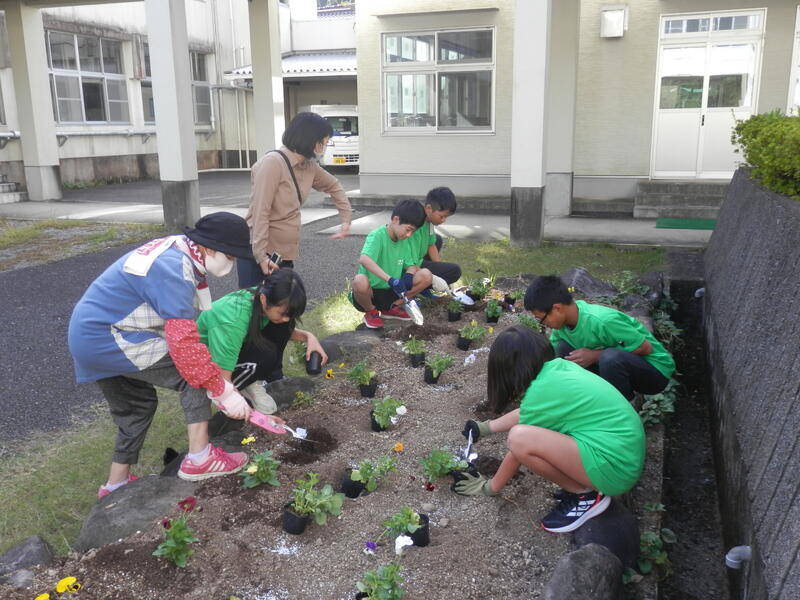10月28日(火)に地域の方々の協力を得て、4年生から6年生で緑の少年団の活動を行いました。夕活動の時間におそろいの緑のTシャツを着て、プランターや花壇の植え替えを行いました。子どもたちは、地域の方々と話し合いながら、「元気に育ってほしい」と願いを込めて、植えることができました。植え替えには、球磨村のマスコットキャラクター「球磨太郎(くまんたろう)」も協力いただき、場を盛り上げてくれました。