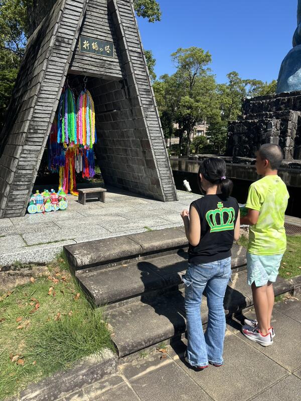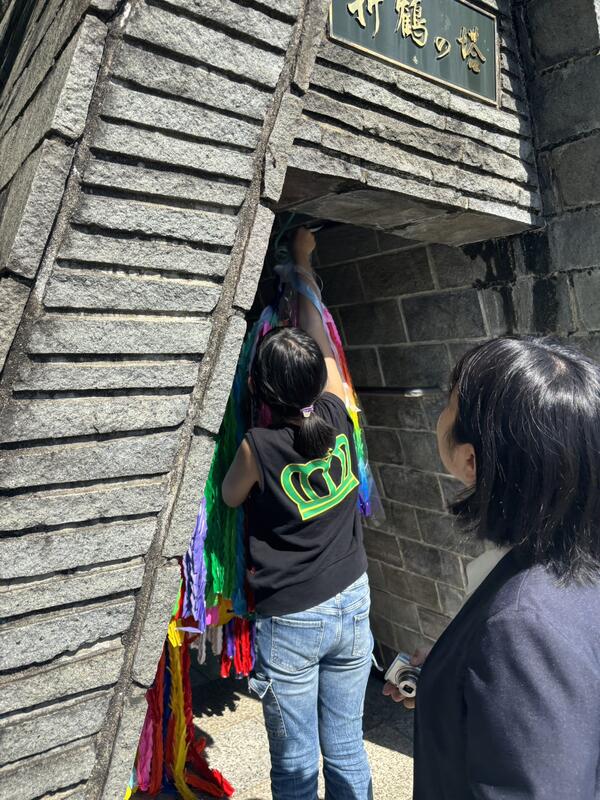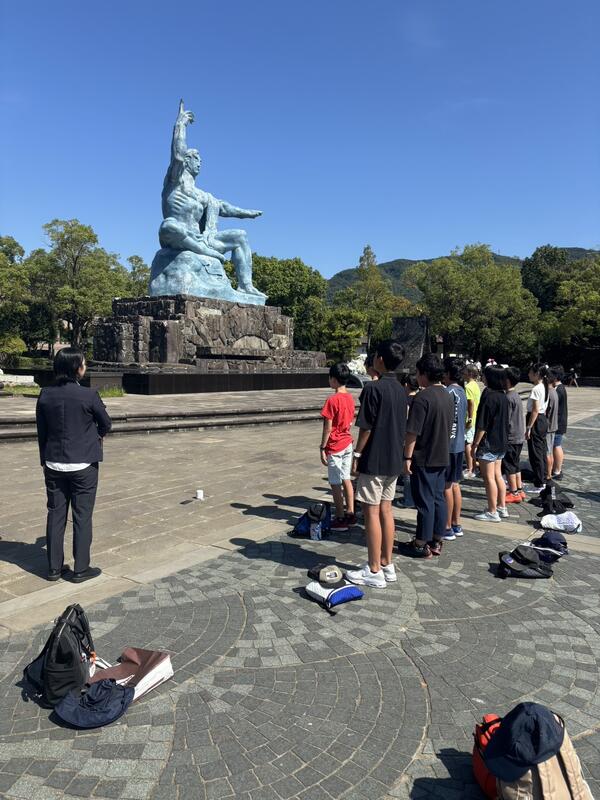 長崎の平和祈念公園に到着しました。長崎の平和祈念公園では、児童たちが平和集会を開き、祈りを込めて折り鶴を手作りし、慰霊碑に捧げました。未来への願いが静かに空へと広がります。