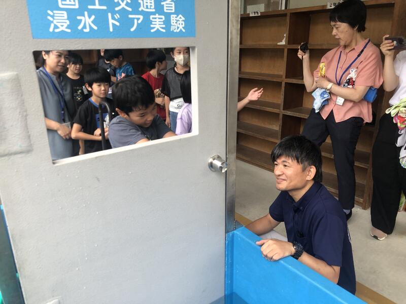 浸水ドア実験では、浸水したドアを内側から開けることができるかの体験を一人ずつ行いました。身をもって体験したことで、様々な感想を持った児童生徒。