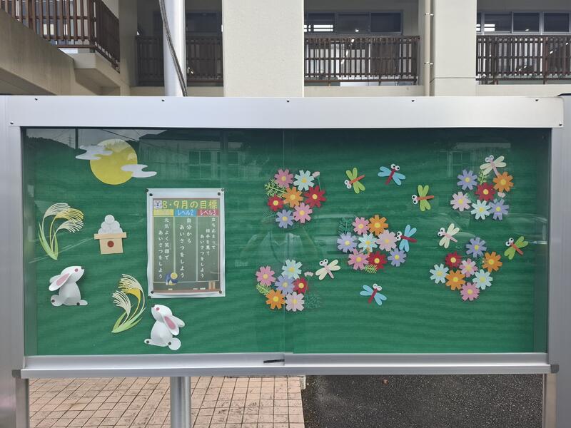 2学期が始まり、学校に子供たちの声が戻ってきました。9月に入っていますが、残暑が厳しいです。北校舎、南校舎の掲示板もリニューアルされ、秋を感じる内容になりました。子供たちも残暑に気をつけながら、生活してほしいです。