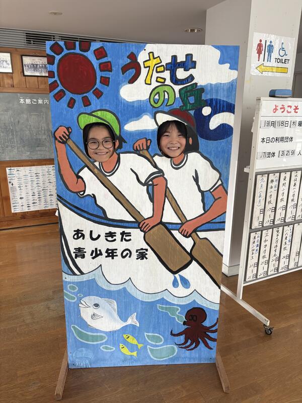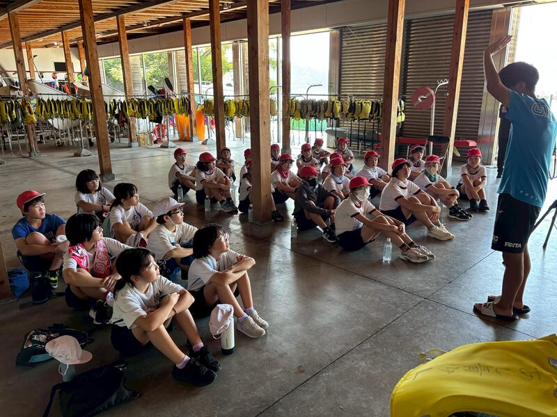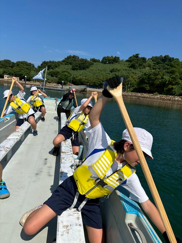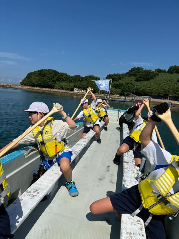 2日目の午前中は、待ちに待ったマリン活動。ペーロン船を力を合わせて漕ぎます。7人の力が合わされば、グイグイ船も進むはずです。まずは、所員の方の説明を聞いて、精一杯がんばります。