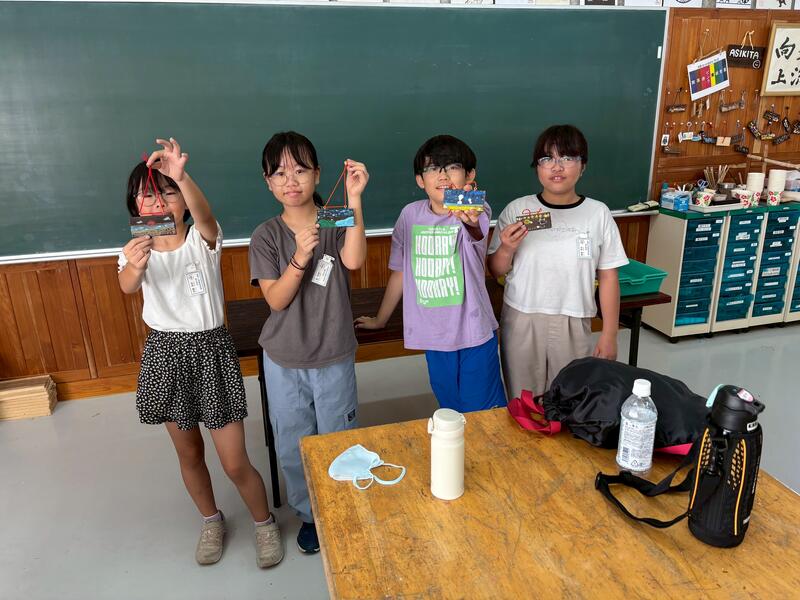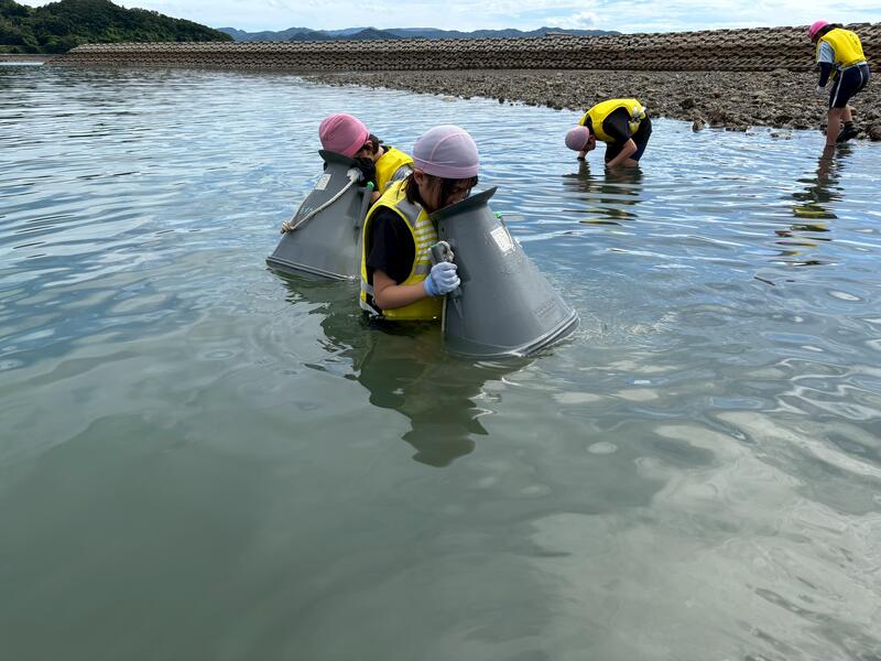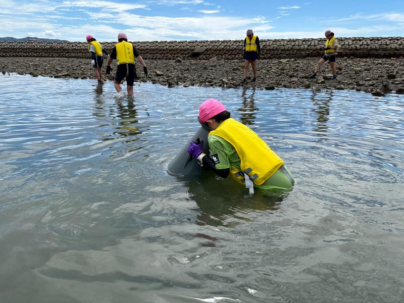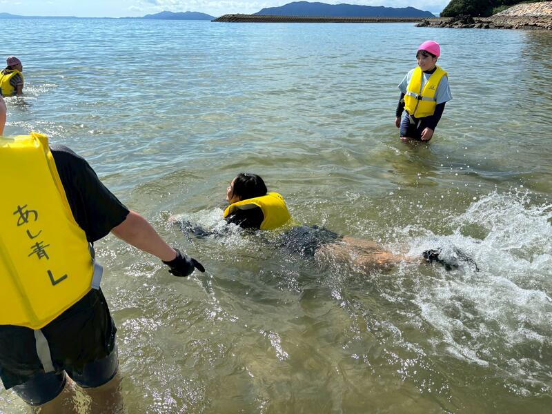 午後からの活動は、礒観察と海水浴です。水中を見ることのできる箱メガネを施設からお借りして、磯の生き物を観察しました。様々な生き物が生息していました。その後は、海水浴を行いました。