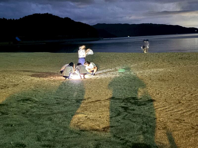 「夜の散歩」の様子です。海風に当たりながら、海岸を歩いて、夜に活動している生き物の観察や景色を眺めました。