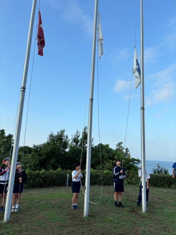 外の活動では、あいさつ運動、花の水遣り、国旗等の掲揚。