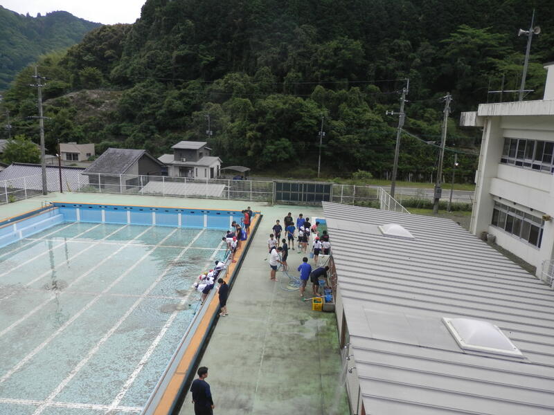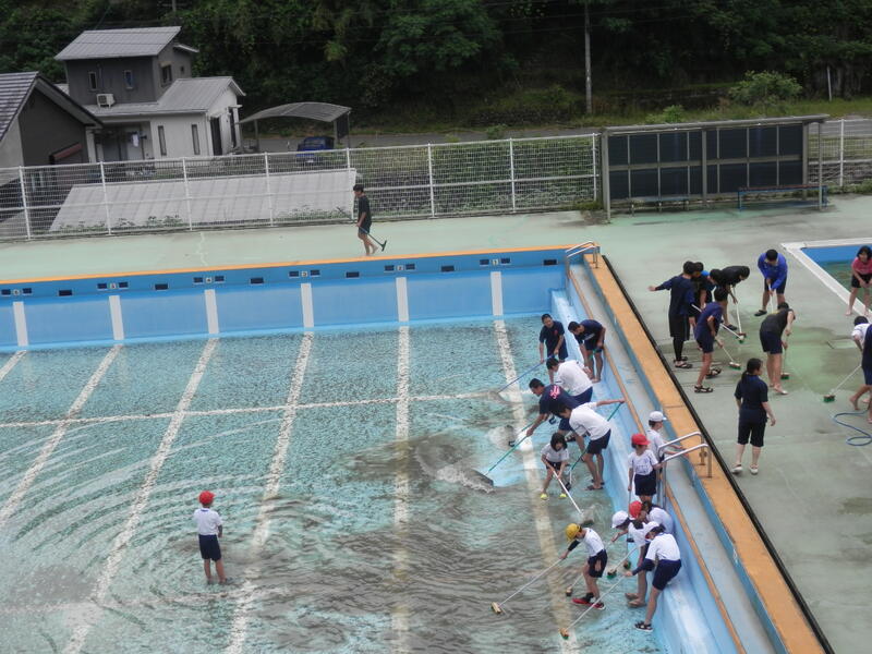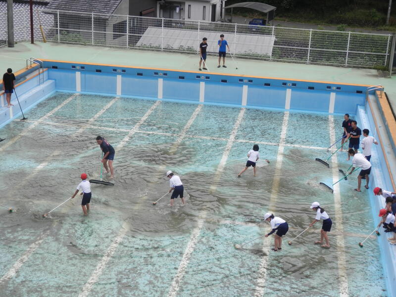 5月26日(月)に少し肌寒かったのですが、4年生と9年生が協力し合って、北校舎のプール掃除を行いました。楽しいプールの授業になるようたまった泥を出したり、草むしりをしたりすることができました。授業が楽しみです。