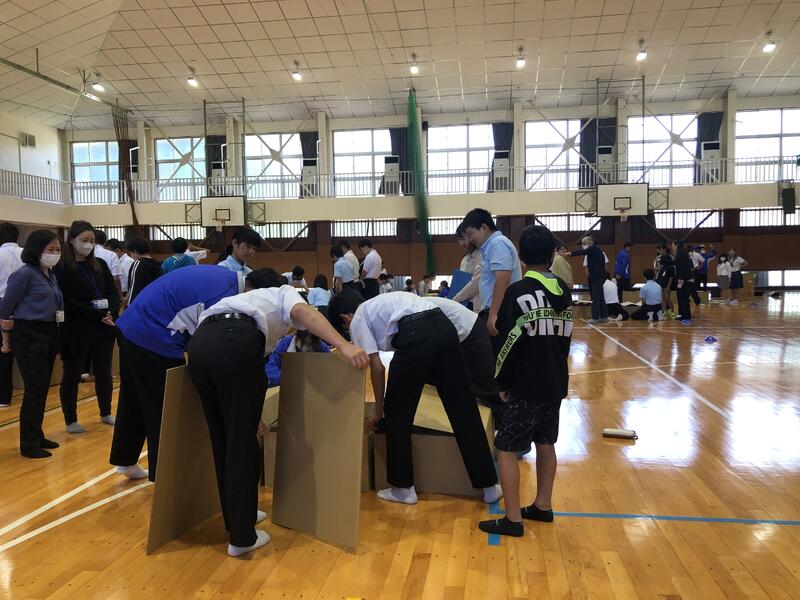今回は、縦割り班に分かれて、段ボールベッドの組立て体験をしました。
