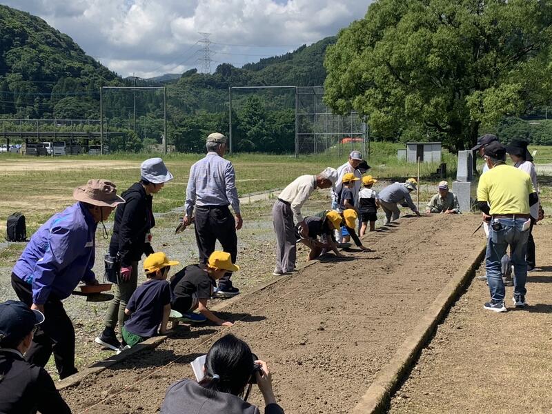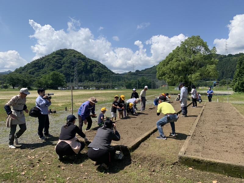 1年生が午前中に、旧渡小学校の運動場に出かけ、はるかのヒマワリの種まきを行いました。